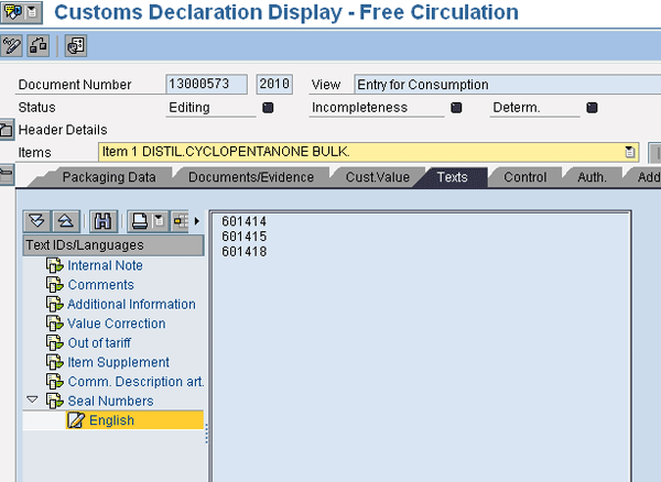 Click the Texts tab to review details captured within the texts (Figure 14). In our example, we have created a text item called Seal Numbers to capture the identification number of the seal used in the vessel shipments.