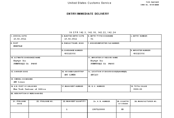 Import filing to customs is performed in different stages, such as cargo manifest, entry summary, automated clearing house (ACH) authorization for duty payment, and finally the daily and monthly statement. For shipments that are sent through vessels, US Customs and Border Protection has mandated that companies send notification 24 hours prior to cargo being set aboard. These are called 10 plus 2 critical data elements. Upon the arrival or prior to the arrival of the goods, the products are declared to the CBP authorities in two formats: CF 3461 (entry or immediate delivery) and CF 7501 (entry summary). With CF 3461, you are notifying the CBP of the goods that are arriving and with CF 7501 you are declaring the goods with values for appropriate duty and other fee payments.