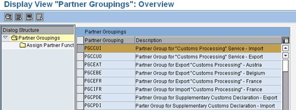 Step 2. Set partner grouping. After defining the partner functions, you need to assign the partner types to the group (Figure 26). Follow IMG menu path SAP Global Trade Services > General Settings > Partner Structure > Define Groups of Partner Functions. There are pre-defined partner groupings delivered by SAP BusinessObjects Global Trade Services. The one for importing in customs management is PSCCUI. Select it and click the Assign Partner Function folder to see the partner functions that have been assigned. If you want to add a new one, click the New Entries button and add a new one as defined in step 1.