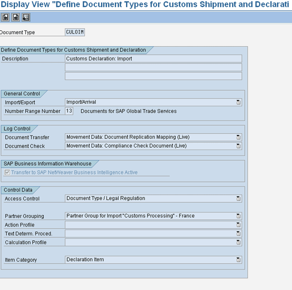 Follow IMG menu path SAP Global Trade Services > SAP Customs Management > Document Structure > Define Document Type. Click the details (magnifying glass) icon to see the information shown in Figure 39. Ensure that there is a Number Range Number defined. Assign Document Type / Legal Regulation as the Access Control, and maintain the Partner Group from the pre-defined options in the drop-down menu.