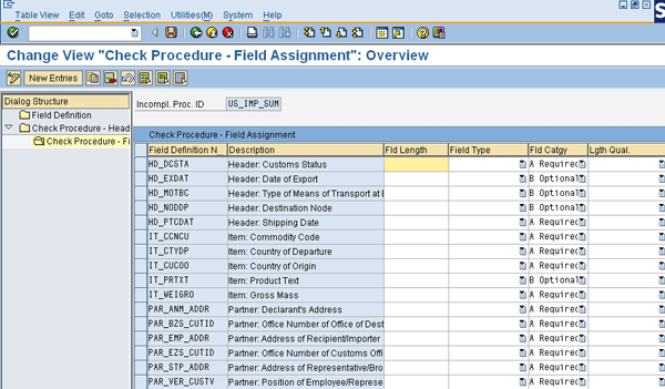 Step 18. Define the incompletion procedure (Figure 46). You use the incompletion procedure to check the completeness of the data before preparing it for import declaration. Follow IMG menu path SAP Global Trade Services > General Settings > Document Structure > Control Incompleteness Checks in Customs Shipments and Customs Declarations. This shows the fields that are checked for completeness. If you want to add any fields, you can do so via the New Entries button.
