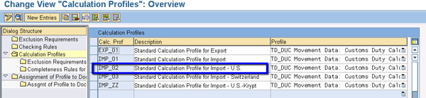 Step 24. Define the calculation profile for the import (Figure 57). Follow IMG menu path SAP Global Trade Services > SAP Customs Management > “Customs Processing” Services > Configure Control Setting for Customs Duty Calculations. Assign a calculation profile in the Calc. Prof column, such as the custom one that we assigned called IMP_02.