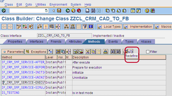 To redefine your interface, click the Methods tab, click the method IF_CRM_SMF_SERVICE~EXECUTE, and then click the redefine icon (Figure 2). For this example, we used code you can download at the end of this article to read the CAD attribute Z_CAMPAIGN into the fact base. The action-handling service later assigns this value to the field CAMPAIGN_ID in the interaction record. Click the activate icon to activate your class (Figure 3).