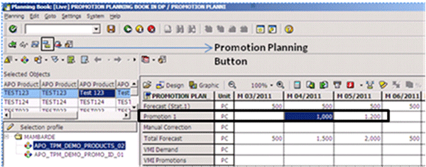 Step 9. Display the promotion key figure in DP interactive planning. In this final step, use transaction /SAPAPO/SDP94 or follow menu path Advanced Planning and Optimization > Demand Planning > Planning > Interactive Demand Planning and review the Promotion 1 key figure (Figure 10). The promotion has been created for product TEST123 for April 2011 for 1,000 pieces and for May 2011 for 1,200 pieces. The Forecast key figure is calculated by the demand planner using statistical models. You can then add the baseline statistical forecast to the promotion to calculate the total forecast. The total forecast is then released to APO SNP for supply planning to meet the increased promotion demand.
