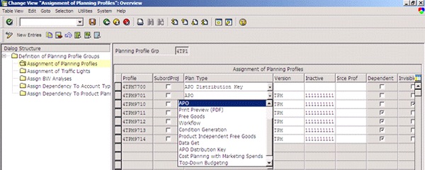 Step 3. Create the planning profile groups in SAP CRM customizing. Go to the IMG and follow menu path Customer Relationship Management > Trade Promotion Management > General Settings > Define Planning Profile Groups. The plan types are available as read-only planning data, and are used for specific marketing functions, such as the print preview or SAP APO integration. Choose Plan Type APO, which reads the uplift quantity in the SAP APO integration interface (Figure 4). This enables you to evaluate whether a promotion is feasible by transferring it to DP and checking for supply.