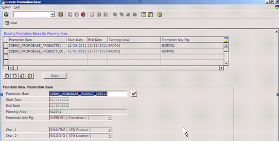 Step 5. Maintain the promotion key figure for the DP planning area, as this is a mandatory setting to create a promotion base later. Figure 6 shows the definition of the promotion key figure and level for a planning area using transaction /SAPAPO/MP33 (Maintain Promotion Key Figures). I entered 9ADP01 in the forecasting Planning Area, the key figure is 9APROM1 to store promotions at the lowest level of product that is stored in the InfoObject 9AMATNR. Under the Promotion Key Figure, 9APROM1 is the standard info object for Planning Area 9ADP01 used by SAP APO to store the promotion quantity. Under the Char. for Promotion Level, 9AMATNR is the standard InfoObject used by SAP APO to store the product number.