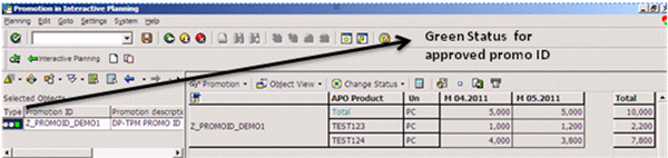 The status of this promo ID is approved as shown by the green icon in the shuffler window (Figure 9). For example, a promotion has been created for product TEST123 for April 2011 for 1,000 pieces and May 2011 for 1,200 pieces. This will be visible later in the key figure in DP interactive planning.