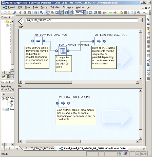 In Figure 1, note how the workflow WF_EGW_POS_LOAD_POS is used three times. Inside the workflow, more than 15 scripts and data flows exist. By using the conditional and variables to drive the logic to design the code with reusability in mind, I reused the same workflow consisting of 15 objects rather than making three separate workflows consisting of 45 objects in total.