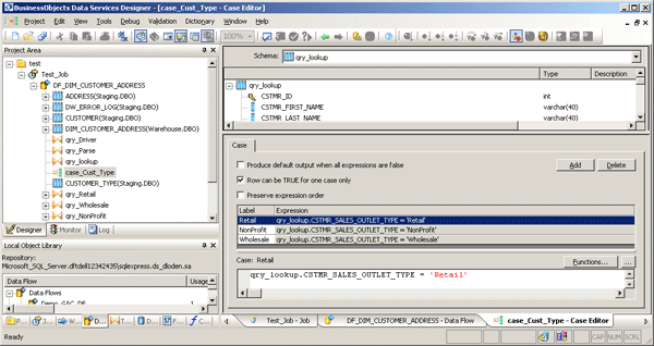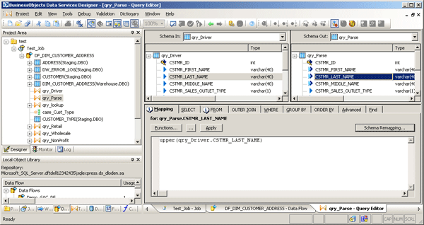 SAP BusinessObjects Data Services is a tool for ETL tasks within your organization. Connectors for SAP BusinessObjects Data Services are available for most common database platforms, as well as application-specific adapters that consume operational processing logic. Adapters for SAP BusinessObjects Data Services are available for systems such as SAP, Siebel, and Oracle. The examples I use demonstrate customer and customer_address data merging to form a customer dimension in a data mart. SAP BusinessObjects Data Services is ideal for operations like these, using its graphical transforms to fulfill dimensional needs right out of the box.