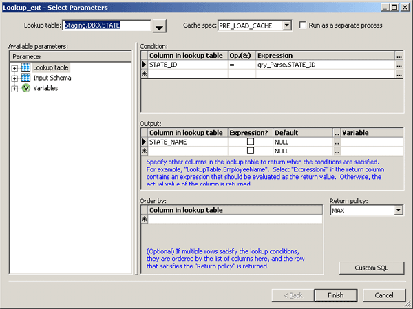 You can also create lookups by using the SAP BusinessObjects Data Services graphical user interface (GUI) as shown in Figure 7. One great enhancement to the lookup_ext function in SAP BusinessObjects Data Services 3.0 is that after you have written a lookup in the syntax, you can right-click the function statement in the field mapping and SAP BusinessObjects Data Services launches the GUI in Figure 7 to make the function easily readable even to novice Data Services users. This allows a greater sharing and understanding of complex development efforts across the team.