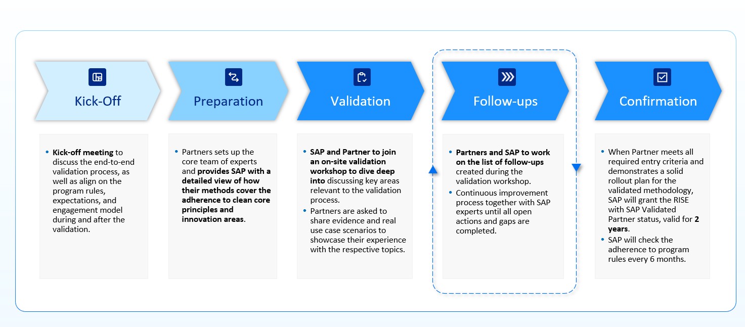 - Confirmation: After all gaps are closed and partners meet all requirements, SAP will grant the RISE with SAP Validated Partner recognition, which remains valid for a period of 24 months, with eligibility checks every six months.