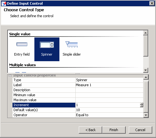 You are now presented with the Input Controls wizard. Select the newly created variable as your source from the selection screen. Next choose the Input method by clicking it; doing so changes the options available below it. For this example, I use the Spinner, which allows users to enter a value of their choosing or use up and down arrows to select a value for the Spinner within the report. Within the wizard, you can also set by how much each click adjusts the value via the Increment option (Figure 3). You can also give the control a relevant business name or leave it as the default source name, which in my example is the variable name. This type of control also requires you to enter a default number into the wizard. There are other properties available, however, these are optional to use. Now you can complete the control by clicking the Finish button.
