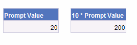 To confirm this works, create a horizontal table and show the prompt value and a calculation. Figure 8 displays two horizontal tables: The first table shows the value from my example prompt, and the second table contains a calculation using the variable I created to capture the prompt “10 * Prompt Value”. In my example, 20 is the prompt value, so “10 * Prompt Value” gives you 200.