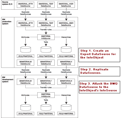 The red boxes in Figure 1 illustrate the three major steps to make the BW production data available for extraction in the BW development system. The illustration uses the popular InfoObject 0MATERIAL. My example uses the 0D_MATERIAL InfoObject from SAP’s demo content.