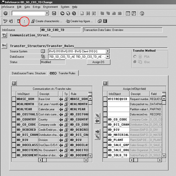 Now you should have a source system connection from the BW QA system to the 0D_MATERIAL InfoSource in BW development. The system then proposes a set of transfer rules. Since BW extracts the master data from the master data InfoObject tables in the BW QA system, any necessary manipulation of this master data occurred when it entered the BW QA system. Therefore, you typically don’t need to perform additional manipulation when copying it to the BW development system. Accept the default transfer rules, which simply move data from the source field to the destination InfoObject as shown in Figure 5. Lastly, click on the activate icon.