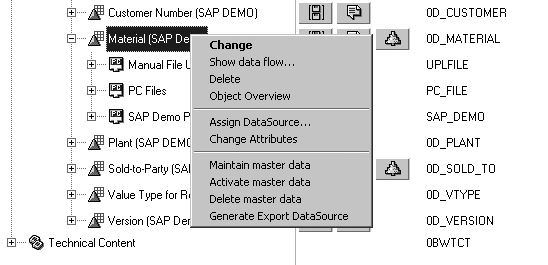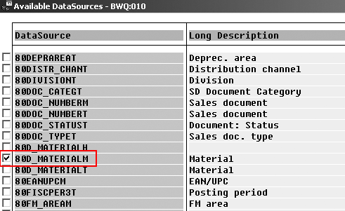 The system generates separate DataSources for the attributes, texts, and hierarchies automatically. In my example, the system created three DataSources: a DataSource for master data attributes (80D_MATERIALM), a DataSource for master data texts (80D_MATERIALT), and a DataSource for master data hierarchies (80D_MATERIALH).