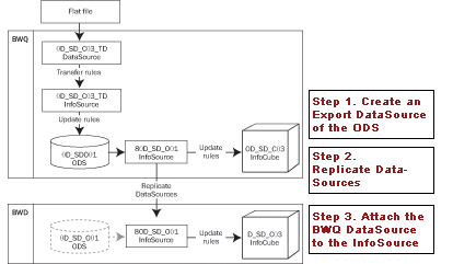 Step 1. Create an Export DataSource of the ODS. In most data mart scenarios, the InfoProvider that provides the data already has an export DataSource to supply that data. The same is true in this example; the export DataSource from the 0D_SD_O01 ODS object already exists, so you do not need to recreate it. If the export DataSource does not yet exist, go to your QA system and follow the instructions in step 1 in the “Transfer Master Data Loads” section.