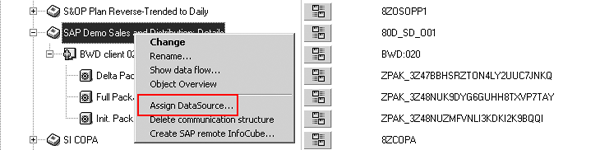 Step 3. Attach the BWQ DataSource to the InfoSource. In your development system, connect the BWQ DataSource and the BWD InfoSource. In the InfoSources tab of Administrator Workbench, locate the 80D_SD_O01 InfoSource and right-click on it. Choose Assign DataSource… (Figure 8).