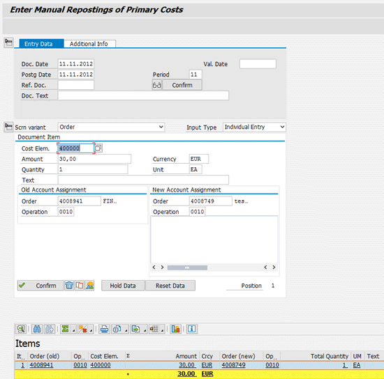 In this example, I’ve selected transaction KB11N, entered the document and posting dates, and switched the screen variant from Cost Center to Order. I then clicked on the document line to focus on the detail of how to transfer costs from one order operation to another.