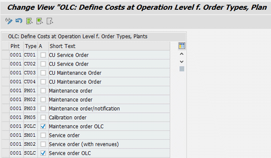 Once you analyze your typical maintenance and service orders, you are ready to activate the operation as an account assignment for your chosen order types. Follow IMG menu path Plant Maintenance and Customer Service > Maintenance and Service Processing > Maintenance and Service Orders > Functions and Settings for Order Types > Costs at Operation Level > Define Cost Settings. Figure 2 shows a list of plant maintenance order types for each plant. In Plant 0001, I activate operation level costing for two order types: POLC (maintenance orders) and SOLC (service orders). I do this by checking off the appropriate boxes under column A (account assignment on activity level).