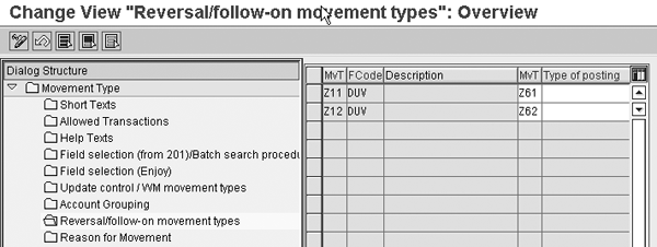 Next, set up movement types for the reversal of the inventory goods movements (movement types 701 and 702). You cannot reverse these in standard SAP, so you need to create new movement types (e.g., Z11 and Z12) by copying movement types 711 and 712. To do this, follow IMG menu path Materials Management>Inventory Management and Physical Inventory>Movement Types>Copy, Change Movement Types and copy movement types 711 and 712 to Z11 and Z12. Make sure that you copy all dependent entries. Do not select Inventory posting for these movement types. Then assign them as follow-on movement types to movement types 701 and 702 by selecting movement types 701 and 702 and choosing Reversal/follow-on movement types, as shown in Figure 11.