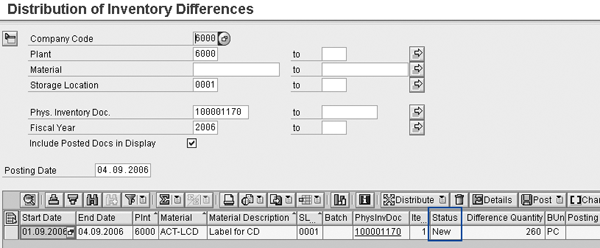 Once you record the 260-unit difference for the storage location, you distribute it to the production orders that used that material in the period. To do this, follow menu path Accounting>Controlling>Pr oduct Cost Controlling>Actual Costing/Material Ledger>Actual Costing>Distribution of Usage Variances>Distribution of Inventory Differences or use transaction CKMATDUV. Enter either the PI document (if you know it) or the materials for which you wish to select differences. Select Distribute and then Include Posted Docs in Display. You see a list of the PI documents processed together with the status New (Figure 4).