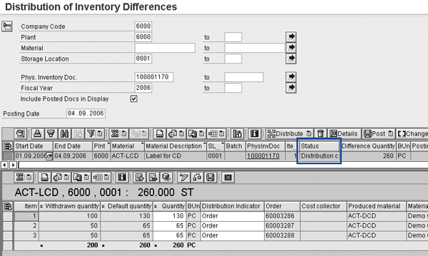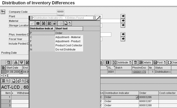 The document contains a list of the materials and batches that you can include in the count, which takes place per storage location. The system includes only quantities recorded in PI documents for which the distribution of physical inventory differences (DD) is active in the distribution (Figure 1). You can perform physical inventory daily, weekly, or even monthly, though I do not recommend you let more than a month elapse if you are doing variance analysis at month-end or want to include the follow-on costs in actual costing.