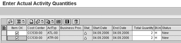 First, follow menu path Accounting>Controlling>Pr oduct Cost Controlling>Actual Costing/Material Ledger>Actual Costing>Distribution of Usage Variances>Enter Actual Activity Quantities or use transaction CKMDUVREC to record the time differences based on workers’ time sheets, machine hour counters, or electricity consumption meters in CO. Note that the system only saves the data if you select Item OK (Figure 7) for each row on the screen.