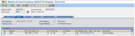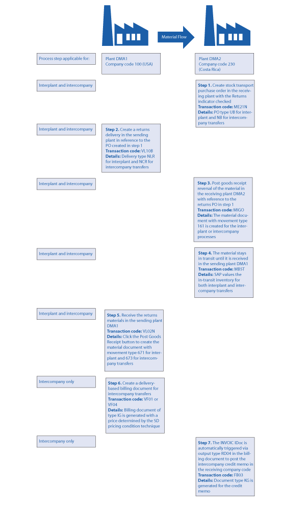 I am using plant DMA1 in company code 100 (USA) as the supplying plant and plant DMA2 in company code 230 (Costa Rica) as the receiving plant. Figure 1 displays the material flow.