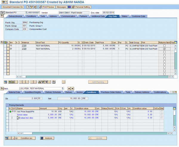 In the purchase order for the original STO, use transaction ME22N to create an additional line item to return the materials by checking the Returns Item indicator in the purchase order line item (Figure 14). The pricing schema proposes a purchase price of $10 (i.e., cost of material ITEM in the original sending plant DMA1).