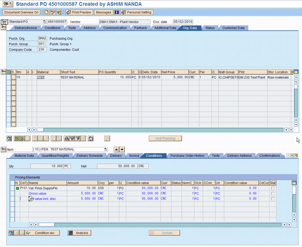 In the stock transport purchase order in Figure 3, the vendor DMA1 maps to the sending plant DMA1 in its master record. This is how the sending plant is determined for the STO process. The condition type P101 picks up the price of the material in the sending plant. I’ll show you later how this price is used to valuate material in the receiving plant using the material ledger.
