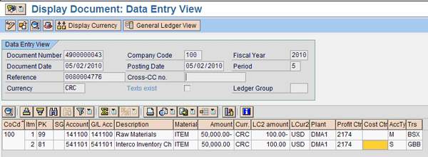 At this point, the material is in transit. Imagine this as the material being transferred in a ship from the US to Costa Rica. From an accounting standpoint, the materials were removed from the books of legal entity 100 the instant you posted the goods issue. However, you must valuate the material in this shipment, which was shipped out sometime close to month end, and bring it to your accounting books as a month-end valuation activity.