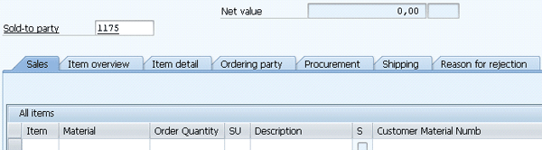 Now you are ready to test the changes. Use transaction code VA01 again. You can see that the main screen now only has two fields on the header: Sold-to party and Net value (Figure 23). There is also no field on the Sales tab (Figure 23) or on the Item overview tab (Figure 24).