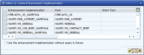 Step 4. In the list, you can see the standard implemented enhancement, but you must not select a standard enhancement implementation and add your code in it because it can be replaced by SAP code in the case of a system upgrade. To create a new enhancement implementation, click the new icon shown in Figure 44.