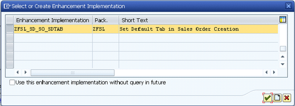 Step 7. Select the new enhancement. Now you can see the newly created enhancement implementation ZFSL_SD_SO_SDTAB (Figure 68). You may need to scroll down to find it. Select it and click the green check mark icon.