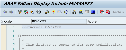 Step 1. Open the program in display mode. You can use transaction code SE80 or SE38. Enter the program name (MV45AFZZ) and click the Display button (in this example, the transaction code used is SE38) to open the program in display mode (Figure 6). The system shows you the code of the program in ABAP Editor (Figure 7).