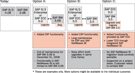 In this scenario, the company has SAP R/3 4.6C and has not yet installed SAP NetWeaver BI (Figure 1). One option (Option A in Figure 1) is to remain on SAP R/3 4.6C through the end of its maintenance cycle in December 2006 and implement SAP BW 3.5 on a separate server.