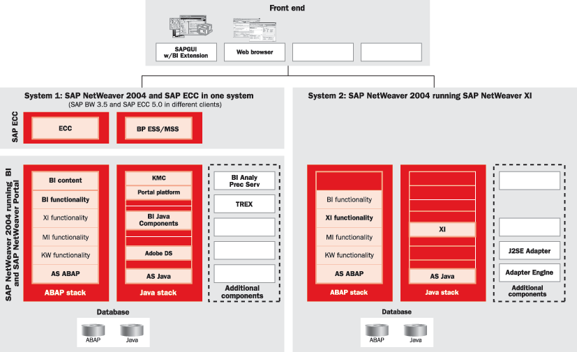 The ABAP and Java stack boxes in the System 1 grouping in Figure 2 illustrate the components of SAP NetWeaver 2004 that are automatically installed on the server when you implement or upgrade to mySAP ERP 2004. You can implement the additional components on the same server as shown, but they are not installed automatically.