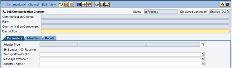 In this screen you enter the Communication Channel name (e.g., Bank Statement upload) and then you have to create parameters for the Sender (in this case the bank) and for the receiver (in this case your company). In Figure 4, you can see the Sender and Receiver radio buttons under the Parameters tab. You can select one of these buttons to define if you are creating the parameters for the sender or the receiver. Click the Module tab and create the parameters for the sender as shown in Figure 5.
