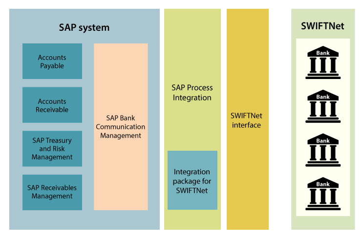 Using SAP Bank Communication Management only in ERP means that the end of the process is the file creation (with storage in temporary sequential objects [TemSe] or File Share). The process of forwarding the file to the bank and any encryption is not part of SAP Bank Communication Management. If you use the SWIFT network for file transfer and have SAP Process Integration, you can use the SAP Integration Package for SWIFT. The SAP Integration Package for SWIFT is installed on SAP Process Integration and handles the exchange of messages between SAP Bank Communication Management and the SWIFT Network that connects all member banks and companies across the world.
