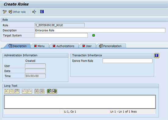 In the main point of entry environment, the security administrator uses transaction PFCG and creates single roles that use the agreed upon naming convention for the business roles. This role does not need to contain transactions, authorizations, or a profile. It is a blank, single role (Figure 2).