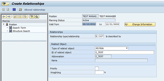 Assigning roles or other objects to positions requires some SAP ERP HCM functional knowledge. Assigning a role entails creating a relationship (infotype 1001) between the Position object (S) and the Role object (AG). The relationship type or subtype is named B007 (Is described by) as shown in Figure 3.