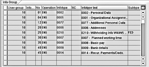 Creating info groups for new hires (initial entry) is probably the easiest. An initial entry new hire does not already have records in R/3, so an info group for that person would contain only the INS operation. That configuration consists of a simple list of the infotypes on which you want to store new hire data and the INS operation for each.