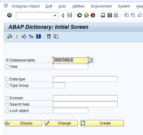 Use transaction SE11 to launch the Data Dictionary initial screen (Figure 1). Enter the table name ZDOCTABLE and click the Create button from the main screen.