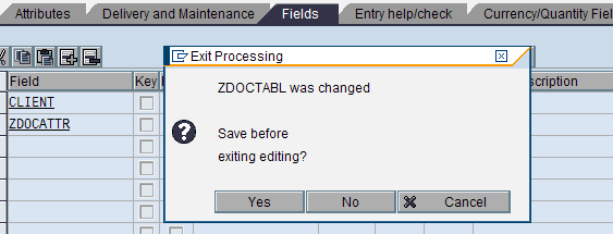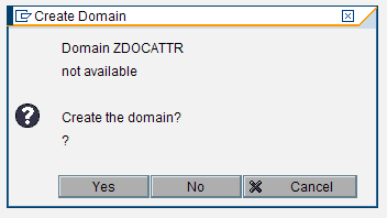 Enter text in the Short Description field and a Domain name to be able to save the data element. In Figure 8, I’ve entered ZDOCATTR for the domain name. If this does not exist, the system gives you the chance to delay creating the data element while you create the domain. In the pop-up screen in Figure 9, click Yes to save.