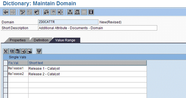When you get to the screen to maintain the domain, enter the data type and the length (Figure 12). The data type has implications on how the custom attribute behaves. For example, if you put in a date-related data type, the system applies date entry rules to the field based on the user’s date settings. Likewise, the system automatically provides a calendar help pop-up when prompting the entry in date fields. You do not need to do anything further to the domain definition. Make sure you conform to your project development standards when defining domains and other Data Dictionary elements.