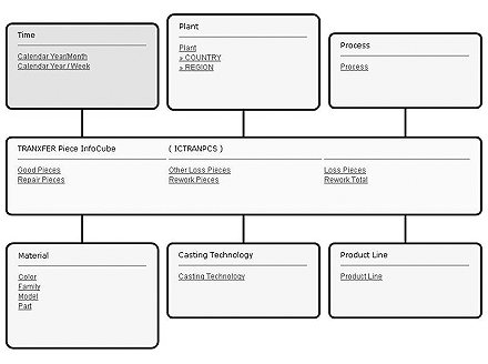 Figure 1 displays star schema for the underlying InfoCube. It was developed to load data from the source application, which tracks shop floor activities in a plant, while the InfoCube stores production counts.