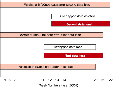The following the scenario is presented in Figure 2, and represents how our approach works. An initial load is performed at end of week 20, and the first delta load commences at the end of week 21. The first delta load contains data ranging from week 12 through week 21. The delta processing requires that data for week 12 through week 20 first be deleted from the InfoCube, and then refreshed with the latest data for weeks 12 through 21. After the first delta load, the InfoCube contains data for week 1 through week 21. The delta load process is repeated on a weekly basis.