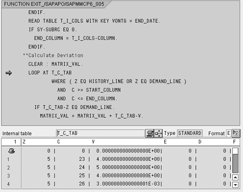 Finally, using the internal table T_C_TAB and the values of HISTORY_LINE and DEMAND_LINE for April 2006 and May 2006, the system reads the required data and derives the DEVIATION_LINE value for the month of June 2006.