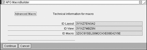 This screen contains the basic elements required for the user exit code to relate the macro to a specific planning book and data view. The user exit for the macro is the same for all the macros. Therefore, to execute only the required ABAP code associated with the macro, you need to add this technical information. The ID Layout field contains the technical ID of the planning book and the ID View field contains the technical ID for the data view.